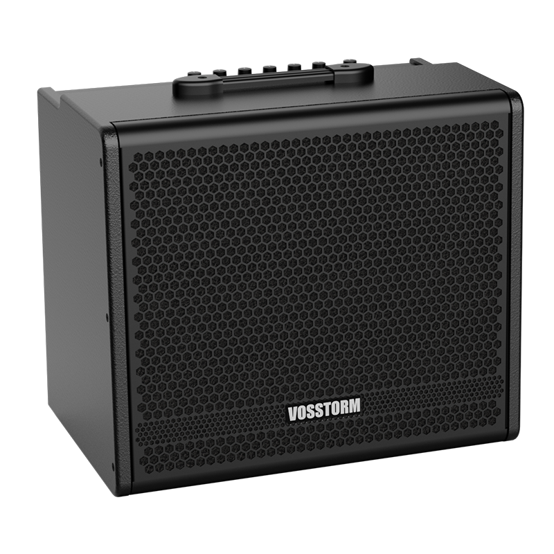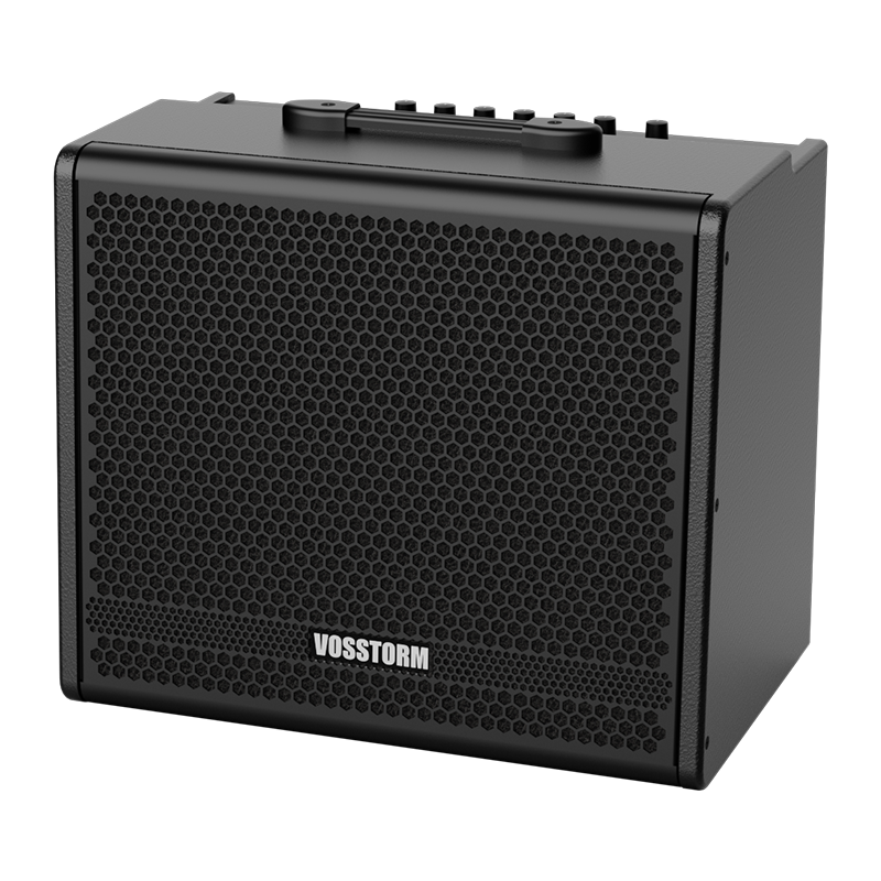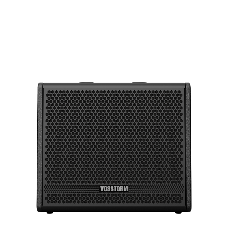 O gabinete acústico bass reflex é construído com MDF e acabamento em poliéster. Na parte frontal, uma tela em aço com furos sextavados e pintura eletrostática texturizada confere beleza e proteção para o alto-falante.