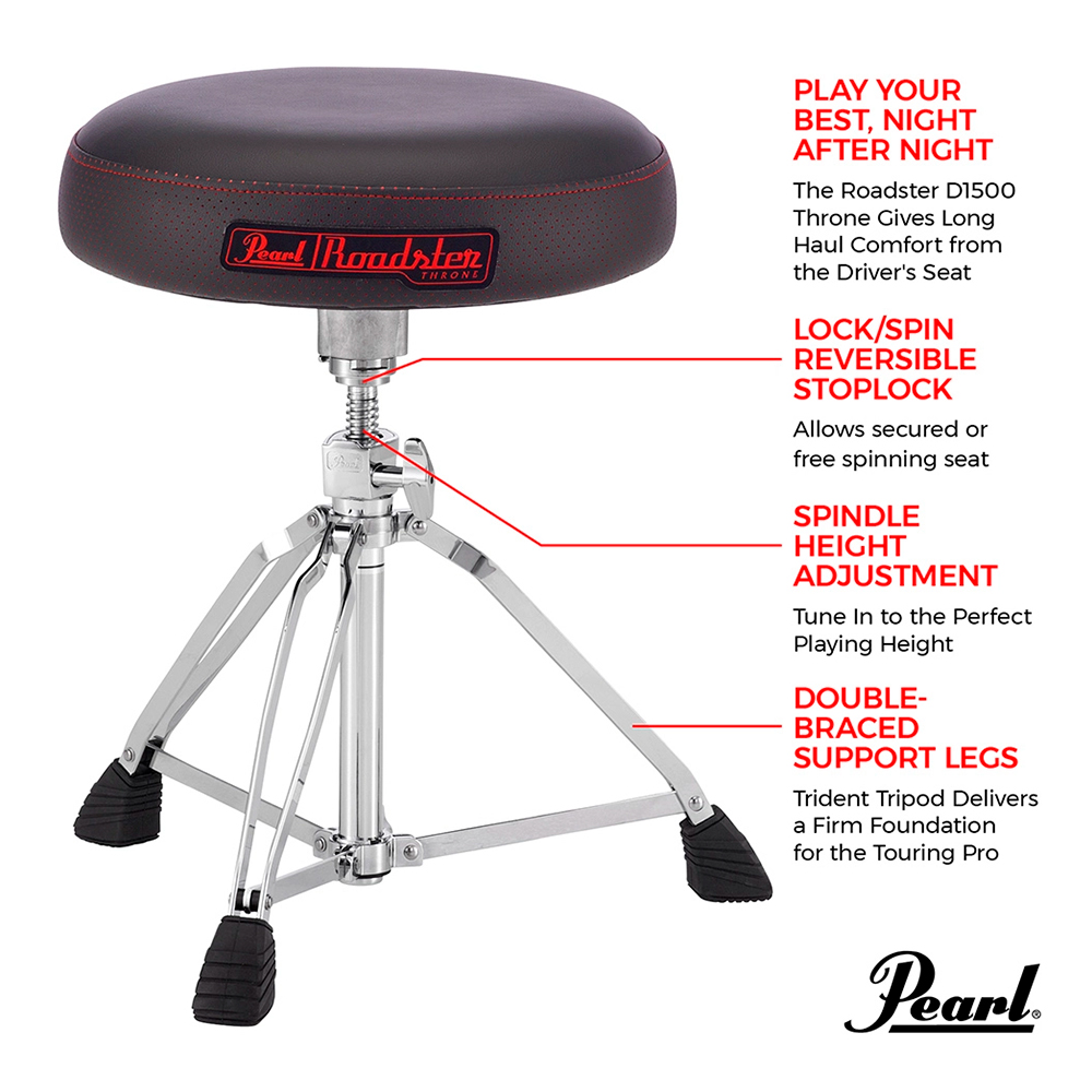 Essencial para um desempenho prolongado e eficiente, os bancos Pearl Roadster apresentam design ergonômico avançado e uma seleção de tampos de almofada temperados por computador para fornecer suporte e aliviar a pressão nas articulações durante longas sessões. O D-1500 possui uma almofada de espuma multi-núcleo em forma de rosquinha, com várias camadas de espuma de densidade variada para melhor toque e toque aprimorado, e seu tripé durável inclui o exclusivo sistema Lock/Spin da Pearl, permitindo que a almofada seja presa no lugar ou fiação livre dependendo da preferência.