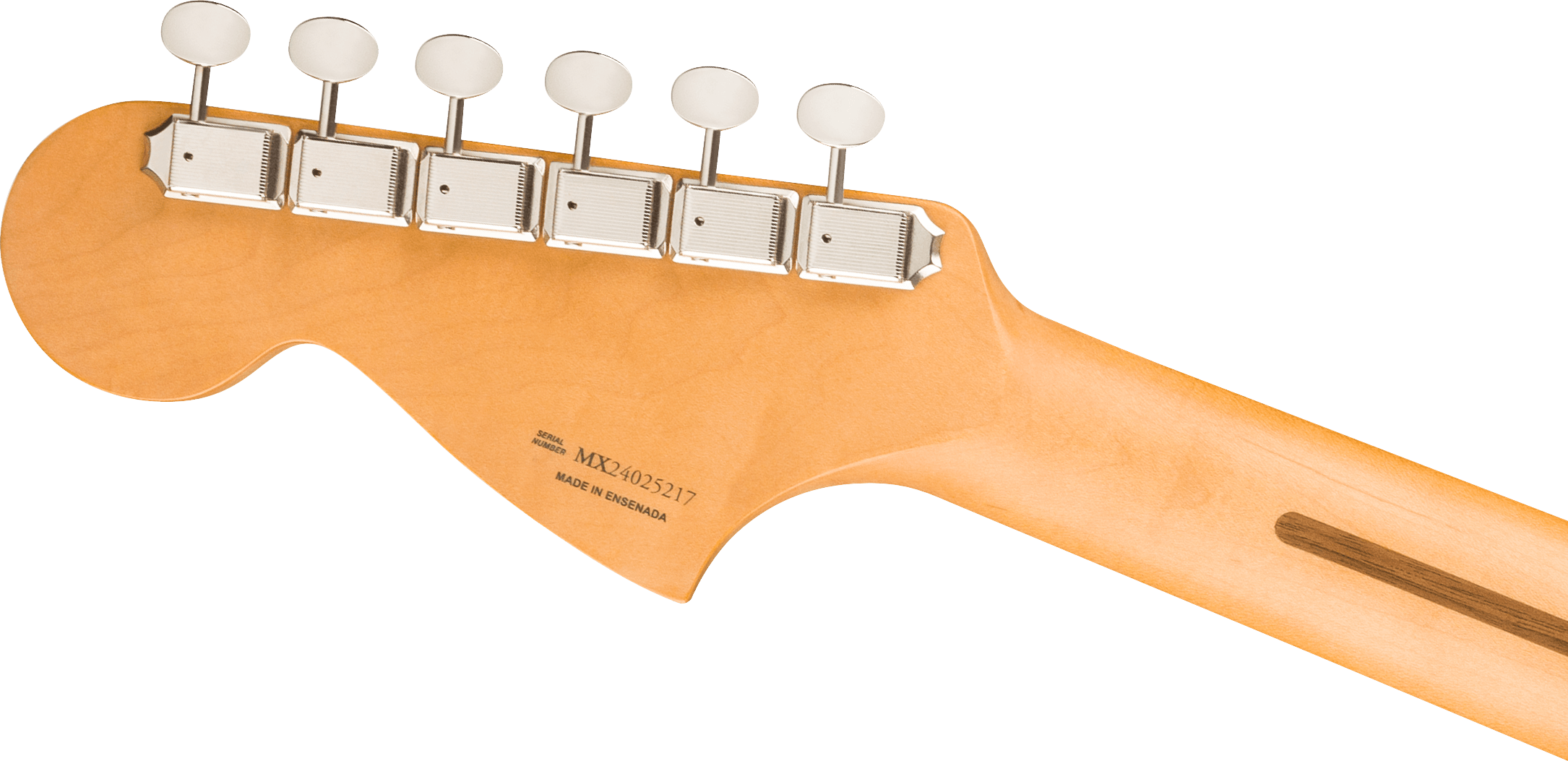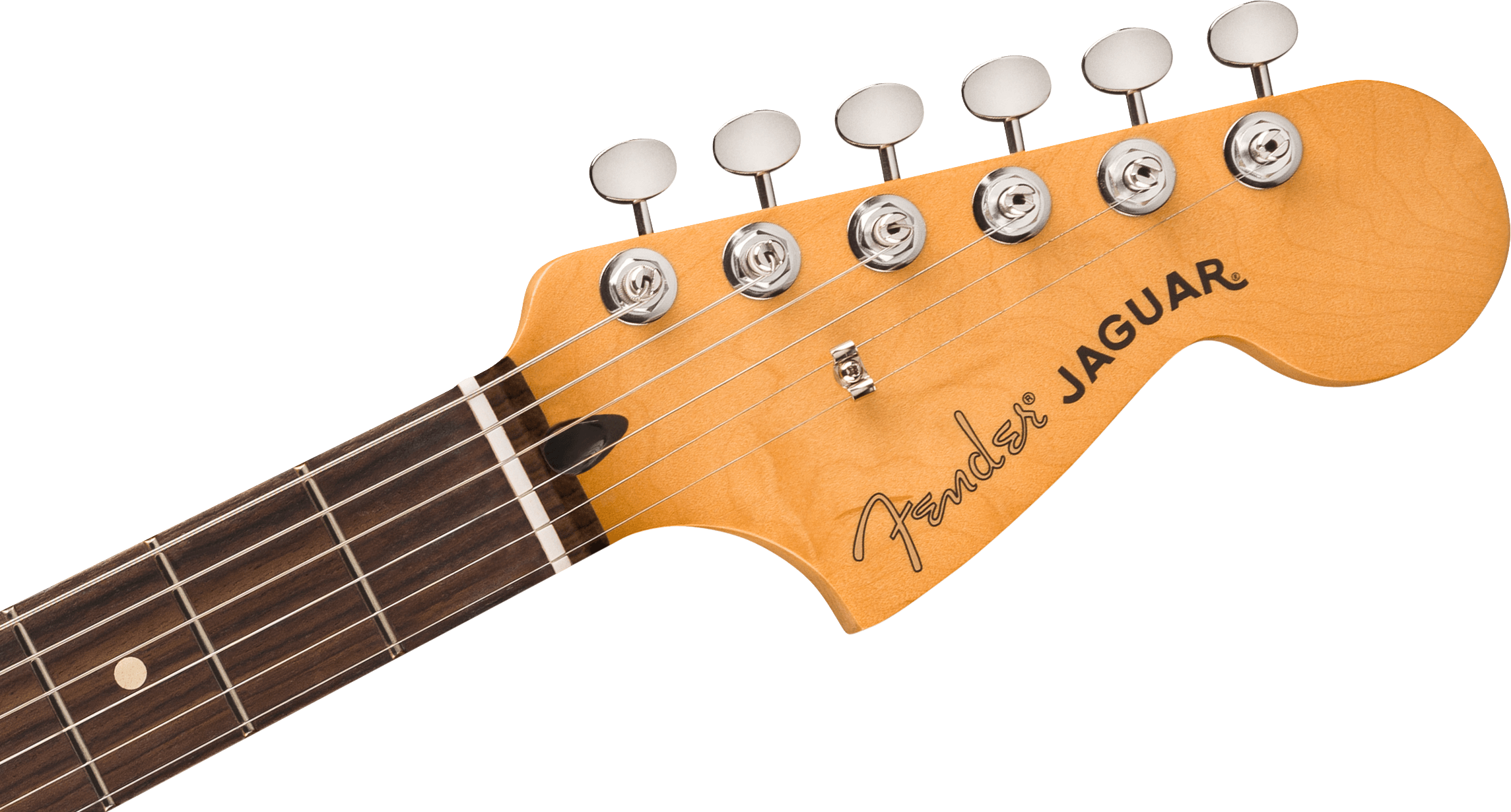 O corpo em alder oferece equilíbrio tonal e resposta dinâmica, com graves definidos, médios expressivos e agudos claros. A escala de 24″ em rosewood, com raio de 9,5″ e bordas arredondadas, proporciona tocabilidade suave e confortável, favorecendo bends e acordes complexos. Equipada com captadores Player Series Jaguar single-coil — Alnico V na ponte e Alnico II no braço — a guitarra entrega timbres claros, definidos e cheios de personalidade. A chave de três posições permite transitar entre sons brilhantes e cortantes ou graves mais encorpados. A ponte Jaguar com saddles Mustang e tremolo flutuante vintage-style garante estabilidade, entonação precisa e vibratos expressivos, enquanto as tarraxas ClassicGear unem visual clássico e desempenho moderno.