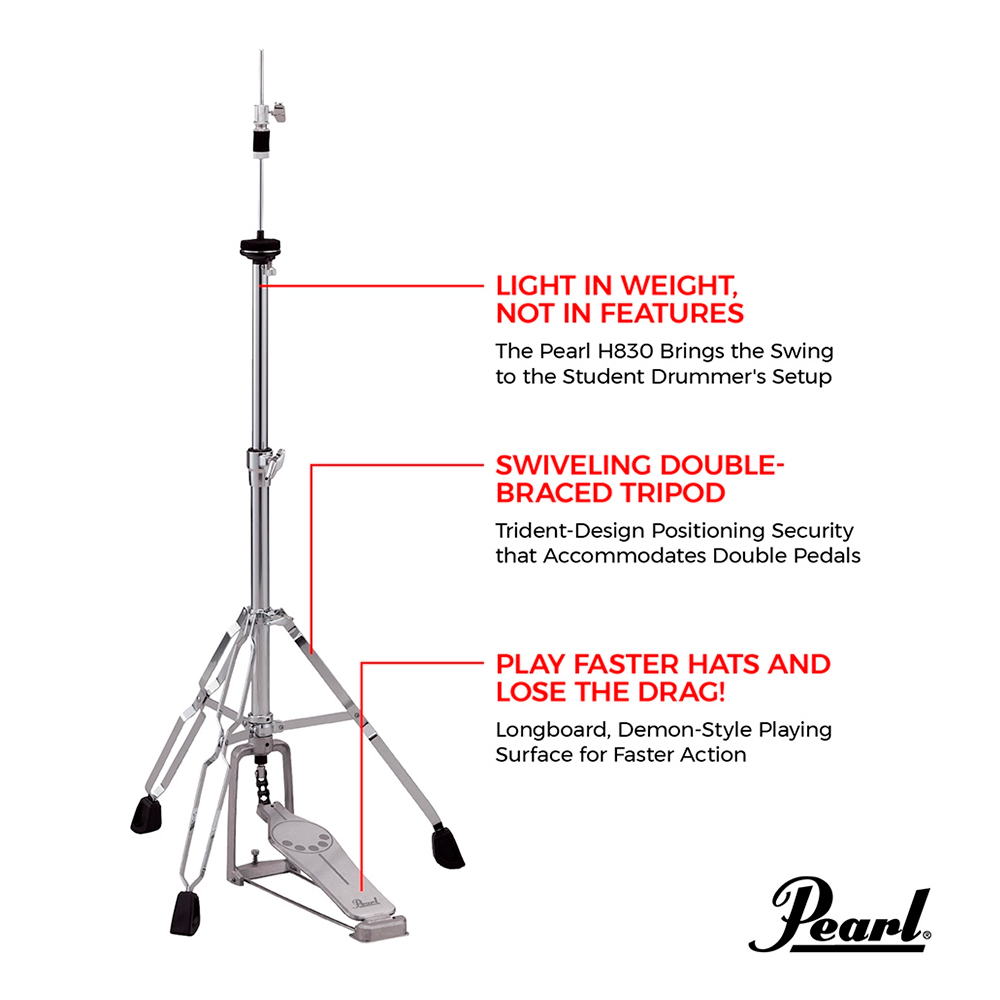 A ação suave e a resposta rápida do suporte Pearl H-830 Longboard Hi-Hat são excepcionais para bateristas de nível superior. Sua base de tripé resistente suporta uma seção principal de duas camadas isoladas para posicionamento de altura privilegiada, e seu pedal giratório abre espaço para adicionar um pedal duplo à sua configuração. Ótimo para shows na cidade e transporte leve e compacto.