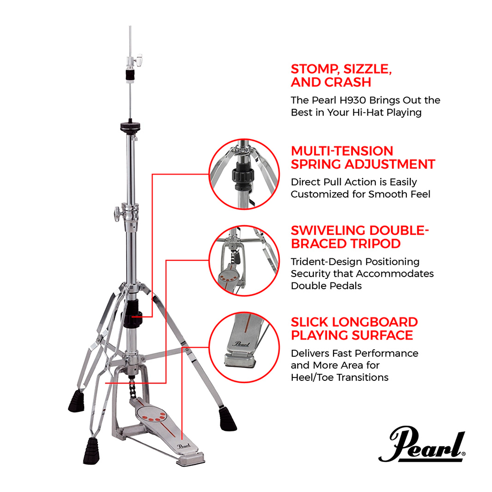 Com estilo inspirado nos Demons e sensação única de prancha longa, as opções personalizáveis dos suportes de chimbal Pearl H-930 Pro são projetadas para eliminar a resistência, reduzir a fadiga e aumentar a velocidade.