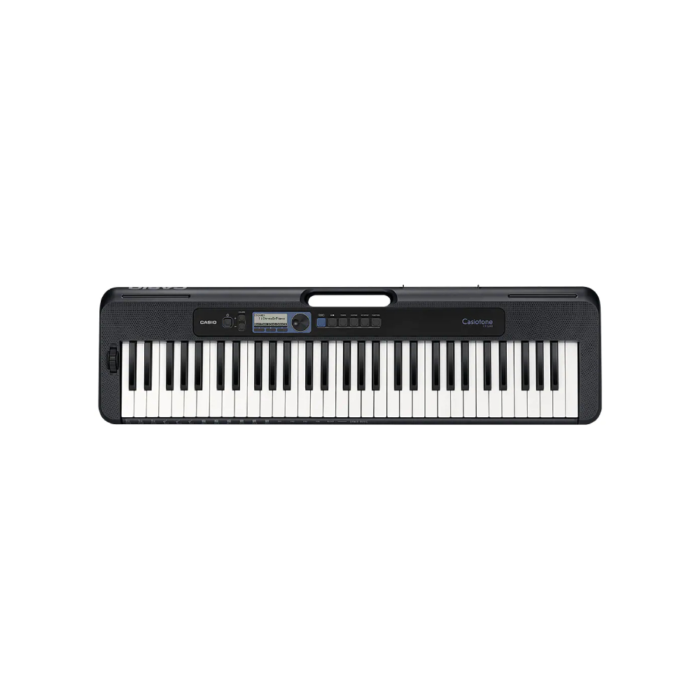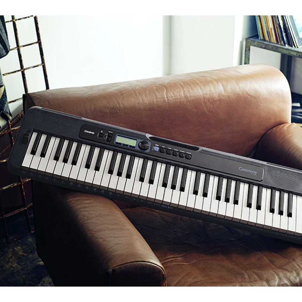Com o CT-S300, você curte sua música quando e onde quiser. Com tamanho compacto, de 930 mm x 256 mm x 73 mm, ele apresenta um volume 30% menor do que o modelo CTK-3500 e oferece aproximadamente 19 horas de autonomia com pilhas alcalinas*. A alça na parte superior do teclado oferece maior praticidade para transporte do instrumento, que pesa somente 3,3 kg. Graças ao design arredondado das suas bordas e arestas, carregá-lo também é muito seguro.